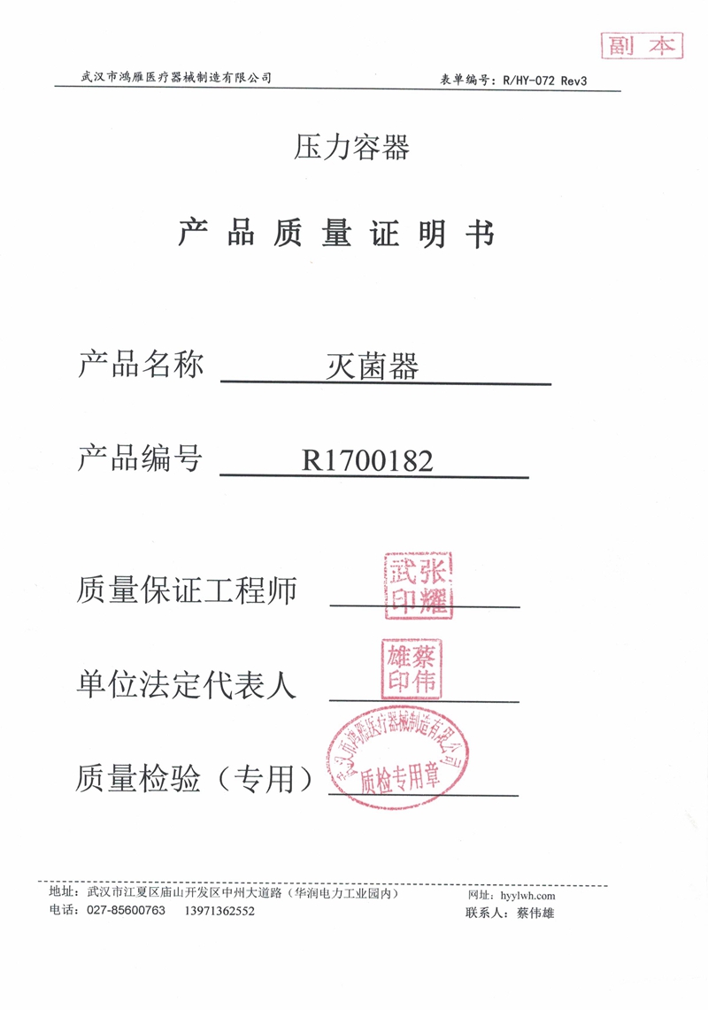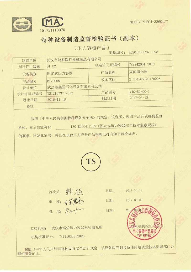 武漢市鴻雁醫(yī)療器械制造有限公司主要從事醫(yī)療器械、各規(guī)格壓力蒸氣滅菌器以及食品、環(huán)保等設備的制造。公司產品受鍋爐壓力容器檢驗研究院和食品藥品監(jiān)督管理局雙重監(jiān)檢,每臺設備均有自己的身份銘牌。公司始終不渝地堅持科技興企、科學管理的方針,重視科技進步為企業帶來的機會和效益,努力將新技術成果轉化為產業優(yōu)勢,秉持以品質穩(wěn)定、產品革新、客戶滿意為公司宗旨。與客戶共創(chuàng)雙贏的局面,分享各項成果,回饋社會。